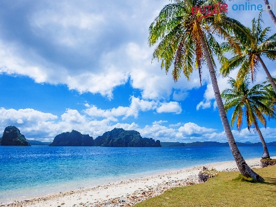 Skały, Morze, Wybrzeże, Tropiki, Palmy, Plaża, Chmury