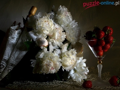 Truskawki, Parasolka, Piwonie, Kompozycja, Kielich, Bukiet