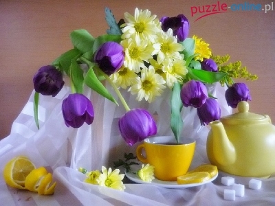 Puzzle Tulipany, Kwiaty, Fioletowe, Dzbanek