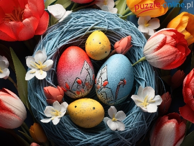 Tulipany, Kolorowe, Wielkanoc, Pisanki, Białe, Niebieskie, Gniazdo, Czerwone, Kwiaty