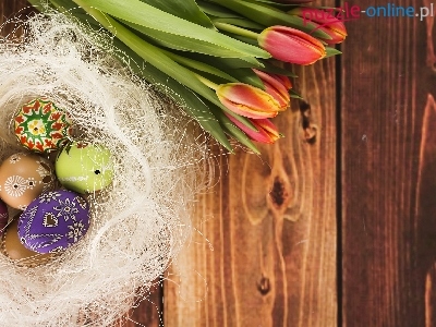 Tulipany, Wielkanoc, Pisanki, Gniazdo, Deski