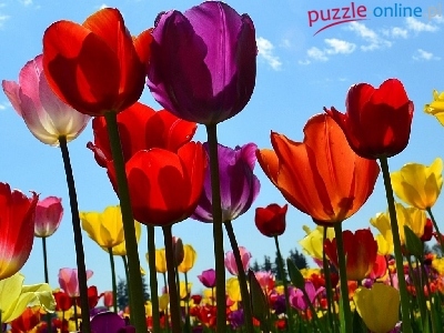 Puzzle Tulipany, Kwiaty, Kolorowe, Niebo