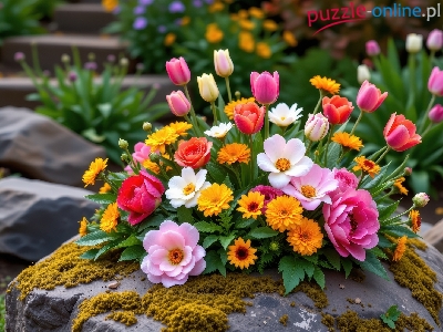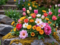 Kamienie, Mech, Liście, Dalie, Róże, Gerbery, Kwiaty, Tulipany