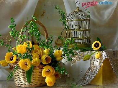 Tulipany, Ptaki, Kosz, Żółte, Klatka