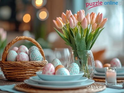 Tulipany, Stół, Wielkanoc, Wielkanocny, Wazon, Talerze, Pisanki, Bukiet, Koszyczek