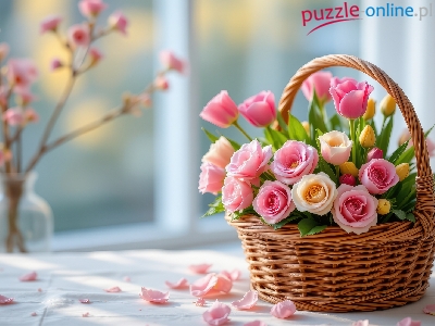 Koszyk, Róże, Kwiaty, Tulipany, Okno, Płatki