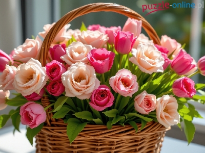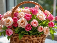 Kwiaty, Tulipany, Róże, Okno, Koszyk
