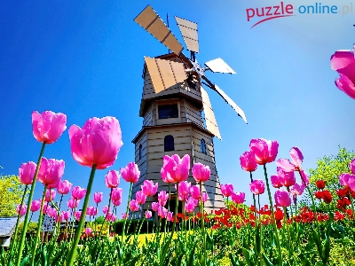 Puzzle Tulipany, Łąka, Różowe, Wiatrak