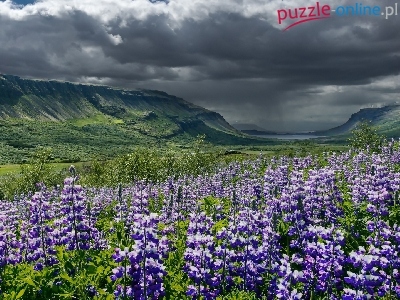Łubin, Fioletowe, Chmury, Islandia, Kwiaty, Góry