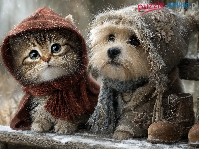 Zima, Kot, Buty, Grafika AI, Ławka, Pies, Ubranka