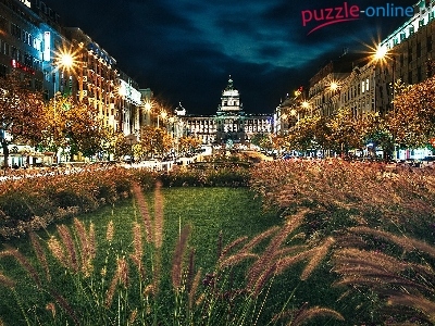 Muzeum Narodowe, Praga, Miasto nocą, Czechy, Plac Wacława, Ulica