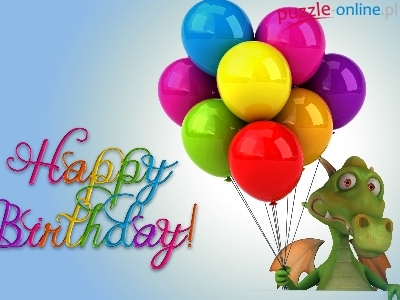 Balony, Urodziny, Tło niebieskie, Śmieszne, Smok, Napisy