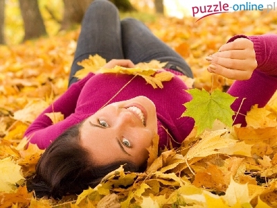 Leżąca, Uśmiech, Zęby, Liście, Kobieta, Jesień, Oczy