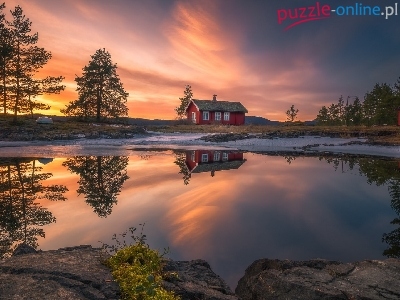 Jezioro Vaeleren, Ringerike, Dom, Norwegia, Zachód słońca, Drzewa