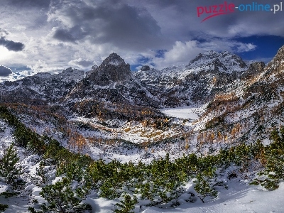 Kotlina Velo polje, Góry, Słowenia, Alpy Julijskie, Zima