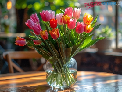 Puzzle Kolorowe, Kwiaty, Tulipany, Wazon