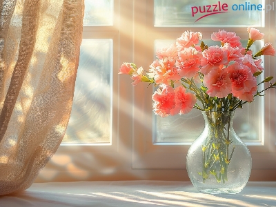 Okno, Goździki, Kwiaty, Wazon, Przebijające światło, Bukiet