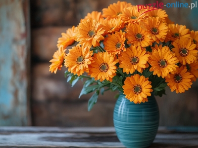 Puzzle Niebieski, Pomarańczowe, Kwiaty, Wazon