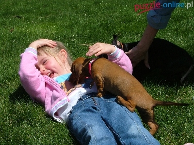 Puzzle Wesoła, Dziewczynka, Jamnik, Zabawa