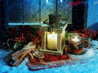 ÅšwiÄ…teczna, Åšwieca, Åšnieg, Lampion, Kompozycja, Okno, Cynamon