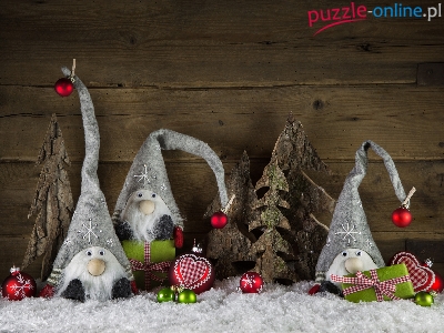 Choinki, Skrzaty, Śnieg, Dekoracje, Boże Narodzenie, Prezenty, Kompozycja, Bombki, Świąteczne
