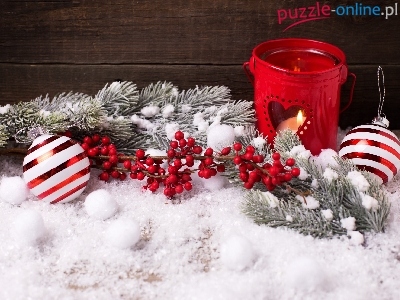 Świeczka, Boże Narodzenie, Dekoracje, Bombki, Śnieg, Kompozycja, Gałązki, Świąteczne