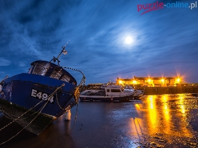 Księżyc, Światła, Motorówki, Przystań, Noc, Morze, Łódź