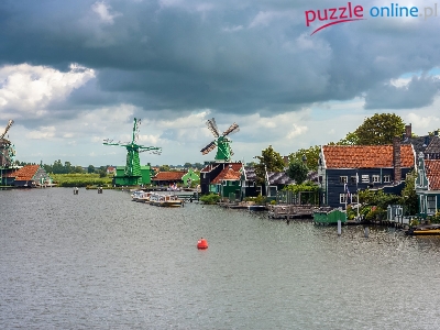 Rzeka Zaan, Zaandam, Domy, Holandia, Skansen Zaanse Schans, Wiatraki