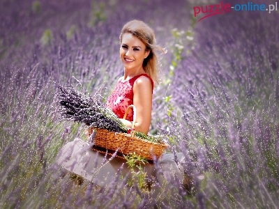 Wiązanka, Pole Lawendowe, Uśmiechnięta, Dziewczyna, Koszyk