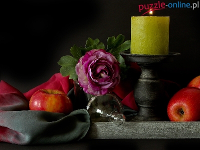 Świeca, Kompozycja, Jabłka, Kwiat, Martwa Natura