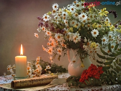 Rumianek, Świeca, Nuty, Wazon, Kompozycja, Bukiet, Jarzębina