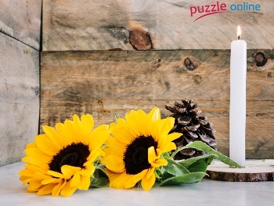 Świeczka, Słoneczniki, Deski, Kompozycja, Biała, Szyszka