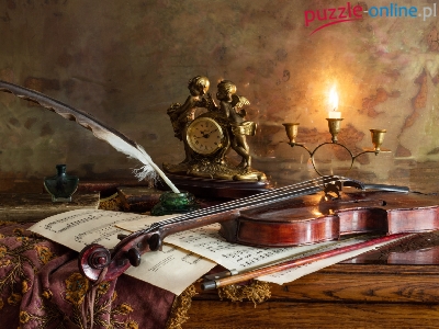 Świecznik, Zegar, Kompozycja, Nuty, Skrzypce, Świeczka, Pióro