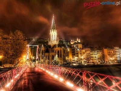 Wieczór, Francja, Most, Światła, Lyon
