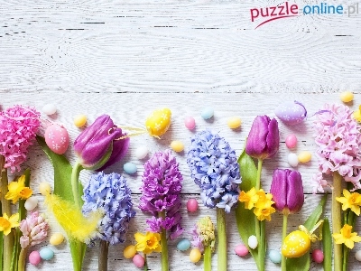 Pisanki, Tulipany, Piórko, Hiacynty, Deski, Kolorowe, Jajka, Kwiaty, Żonkile, Wielkanoc