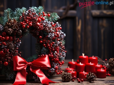 Boże Narodzenie, Kokarda, Wieniec, Świece, Czerwone