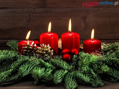 Świąteczna, Boże Narodzenie, Bombki, Stroik, Szyszki, Kompozycja, Świece, Świerk