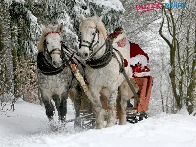 Konie, Święty Mikołaj, las, Mikołajki, Sanie, Zima