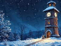 Zegar, Drzewa, Zima, Wieża, Noc, Droga