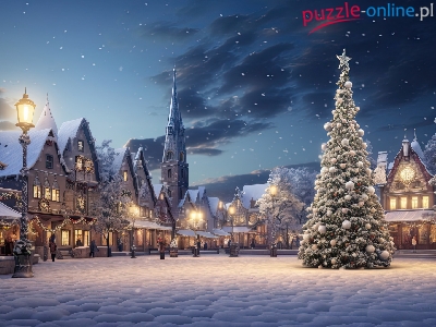 Choinka, Zima, Śnieg, Latarnie, Domy, Miasteczko, Rynek, Światła, Noc, Wieża, Boże Narodzenie