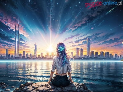Rzeka, Miasto, Grafika, Wieżowce, Promienie słońca, Dziewczyna