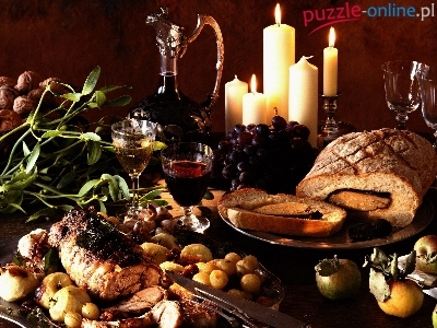 Mięso, Orzechy, Białe, Ziemniaczki, Wino, Pieczone, Jabłka, Świece