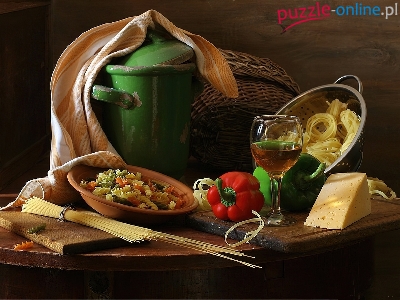 Papryka, Wino, Garnek, Ser, Makarony, Żółty, Stary