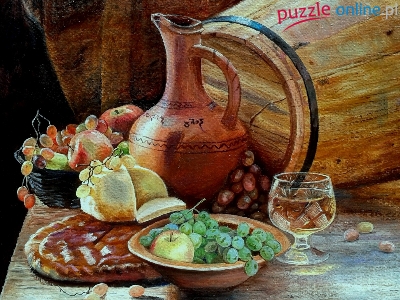 Martwa natura, Siergiej Siergiejewicz Łucenko, Winogrona, Ser, Dzbanek, Wino, Obraz, Beczka, Owoce