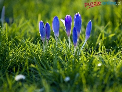 Puzzle Wiosna, Niebieskie, Krokusy, Trawa