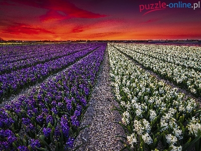 Puzzle Wiosna, Zachód słońca, Plantacja, Hiacynty