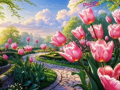 Park, Kwiaty, Tulipany, Wiosna, Grafika, Ścieżka