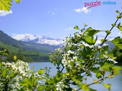 Puzzle Wiśni, Gałązka, Kwiaty, Jezioro
