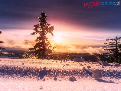 Świt, Drzewa, Zima, Góry, Wschód słońca