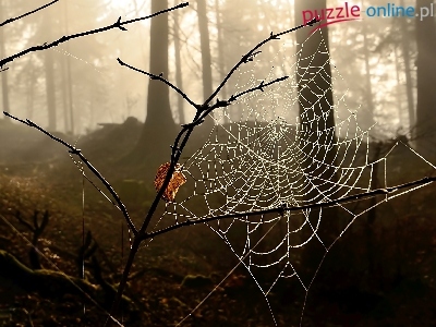 Świt, Pajęczyna, Jesień, Gałęzie, Las, Mgła, Liście